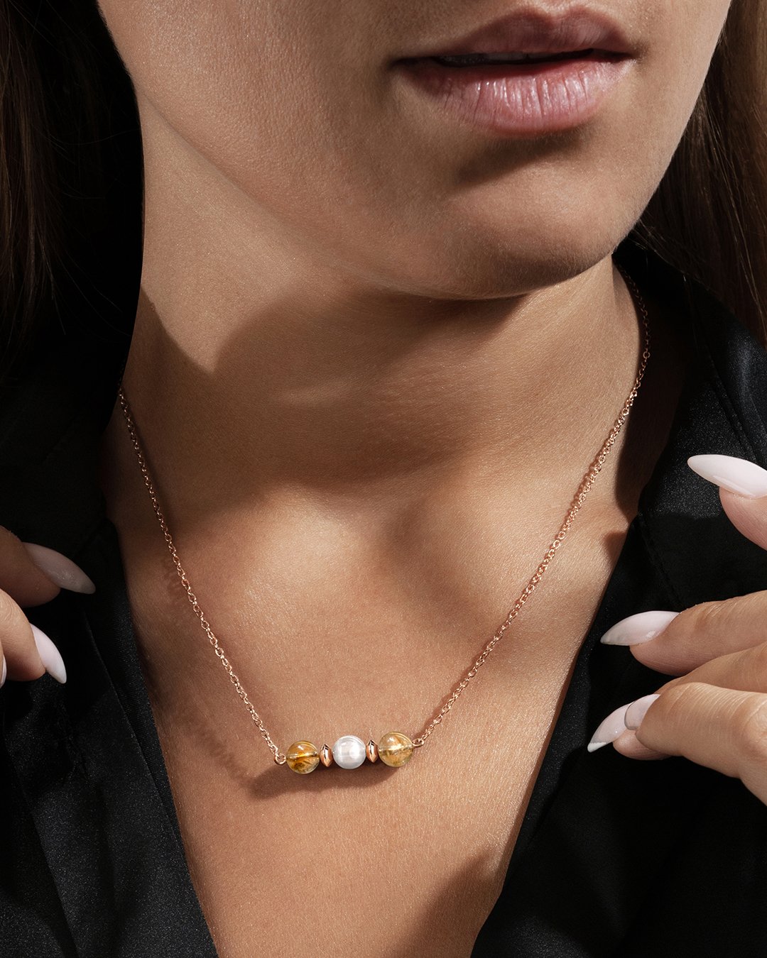 Auf physischer Ebene verbindet sich die von Citrin verliehene Vitalität und Regeneration wunderbar mit den beruhigenden Eigenschaften des Selenits. Diese Kette fördert so eine bessere Schlafqualität, stimuliert die Energie und bietet Schutz vor Magenbeschwerden und Gelenkschmerzen.