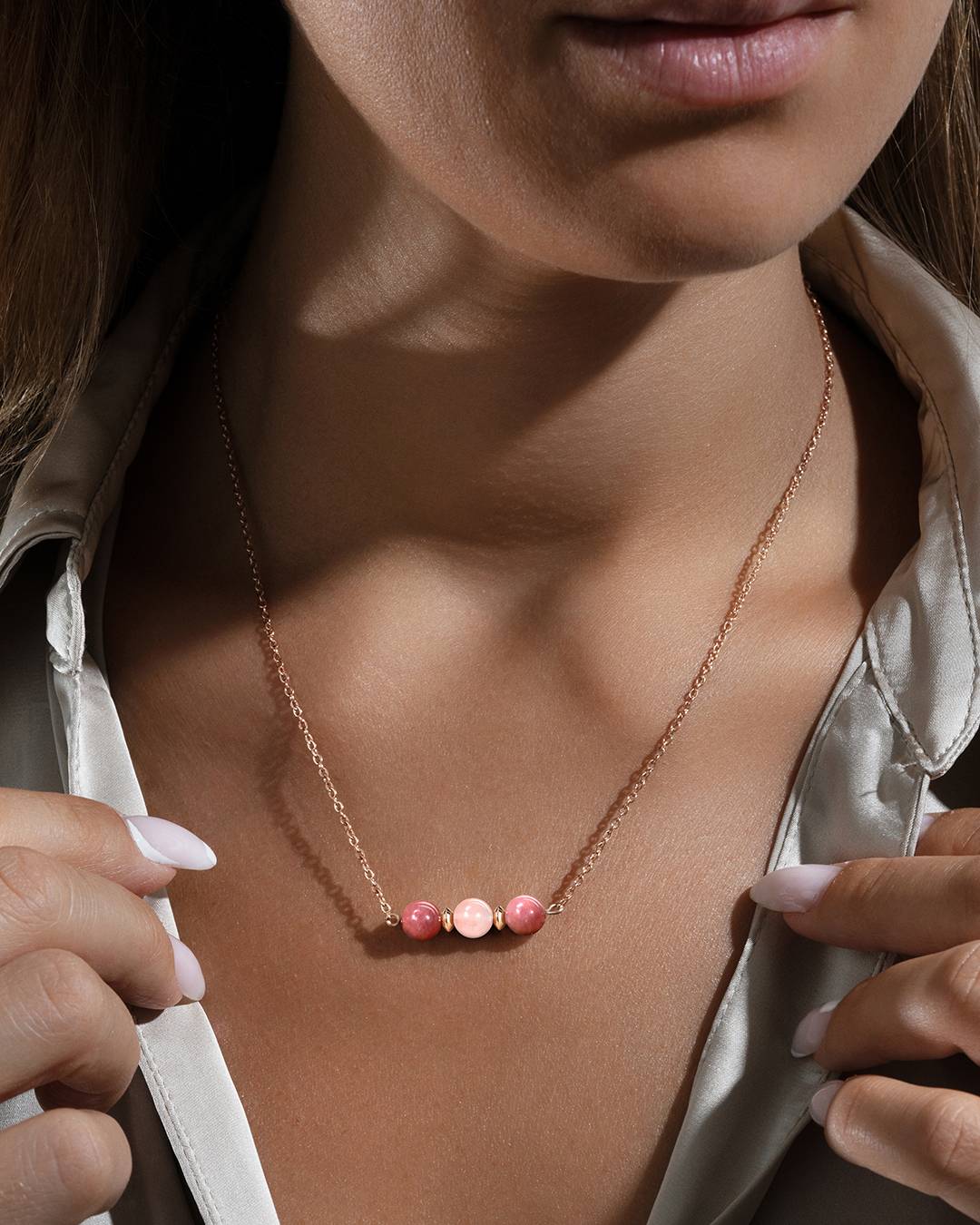 Der Anhänger Ruhe des Herzens zeichnet sich durch drei wunderschöne Natursteine aus, die sorgfältig zwischen rosévergoldeten Trennsteinen angeordnet sind: zwei Rhodonite und ein Rosenquarz.