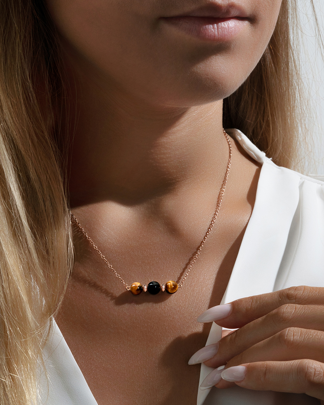 In Kombination bilden diese beiden Steine einen Kokon der Sicherheit. Der Onyx bietet ein stabiles Fundament, während das Tigerauge wachsam wacht, bereit zu verteidigen und zu führen. Der Träger dieser Kette profitiert nicht nur von einem verstärkten Schutz vor äußeren Einflüssen, sondern auch von einer ständigen Unterstützung, die das innere Vertrauen, die Kühnheit und das emotionale Gleichgewicht stärkt.