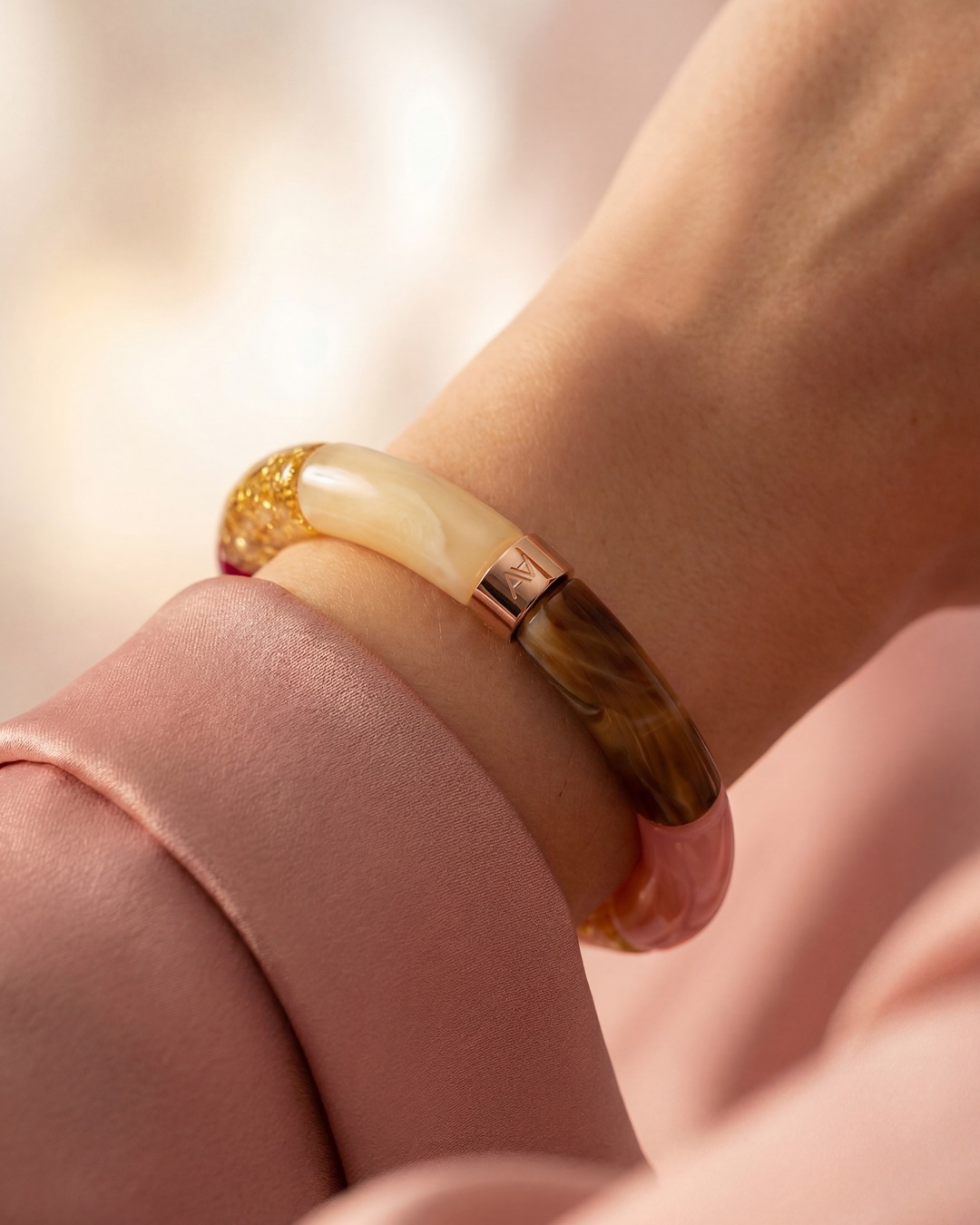 Lassen Sie sich von diesem handgefertigten Acetat-Armband verführen – Symbol für erschwinglichen Luxus und verantwortungsvolle Mode.