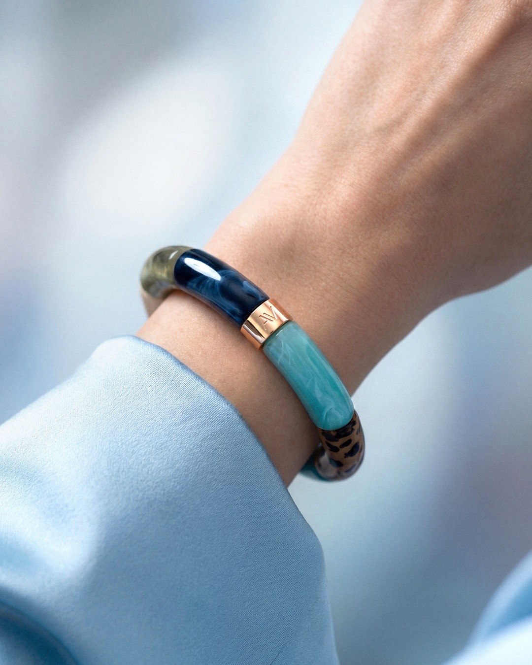Lassen Sie sich von diesem handgefertigten Acetat-Armband verführen – Symbol für erschwinglichen Luxus und verantwortungsvolle Mode.
