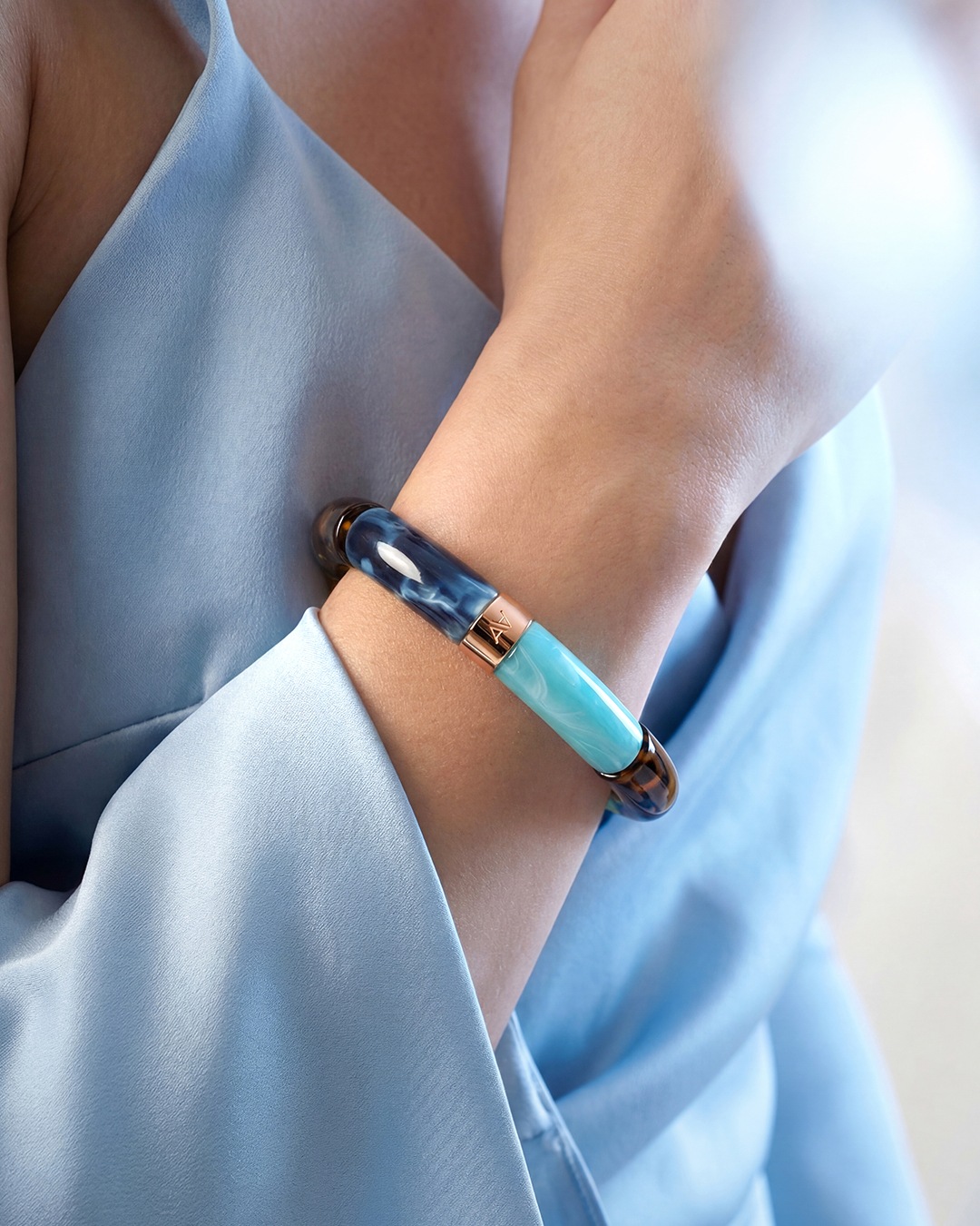 Lassen Sie sich von diesem handgefertigten Acetat-Armband verführen – Symbol für erschwinglichen Luxus und verantwortungsvolle Mode.