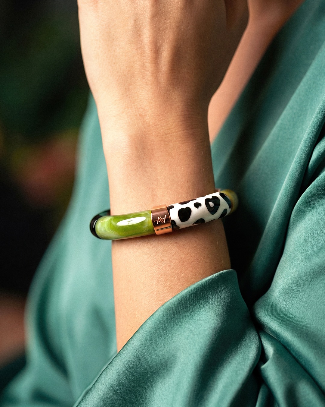 Lassen Sie sich von diesem handgefertigten Acetat-Armband verführen – Symbol für erschwinglichen Luxus und verantwortungsvolle Mode.