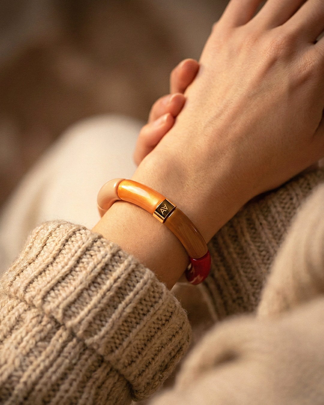 Lassen Sie sich von diesem handgefertigten Acetat-Armband verführen – Symbol für erschwinglichen Luxus und verantwortungsvolle Mode.