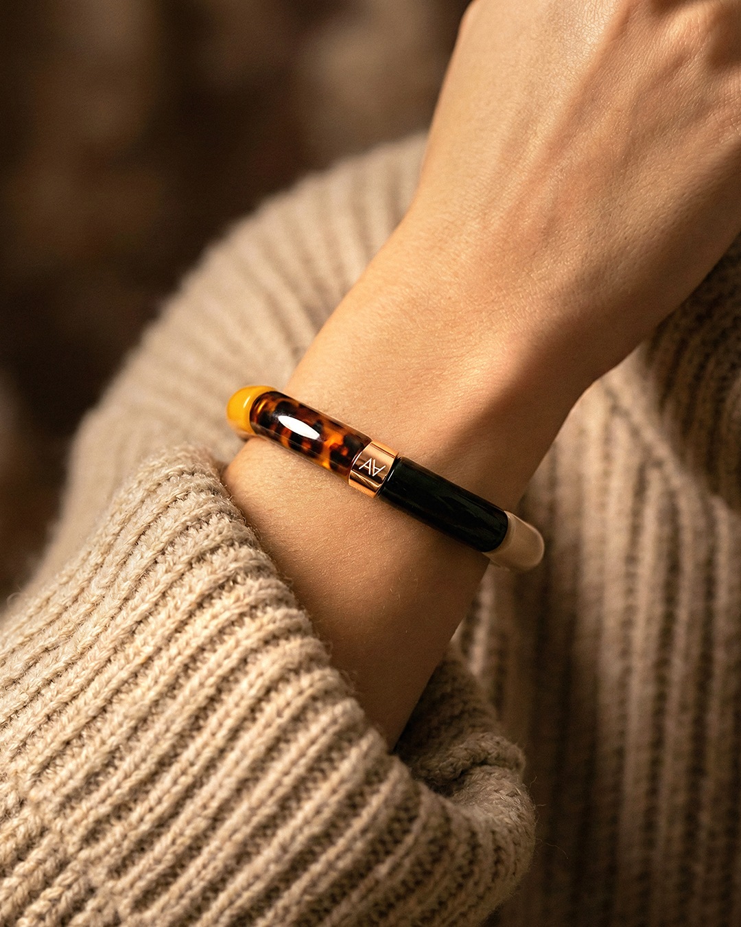 Lassen Sie sich von diesem handgefertigten Acetat-Armband verführen – Symbol für erschwinglichen Luxus und verantwortungsvolle Mode.