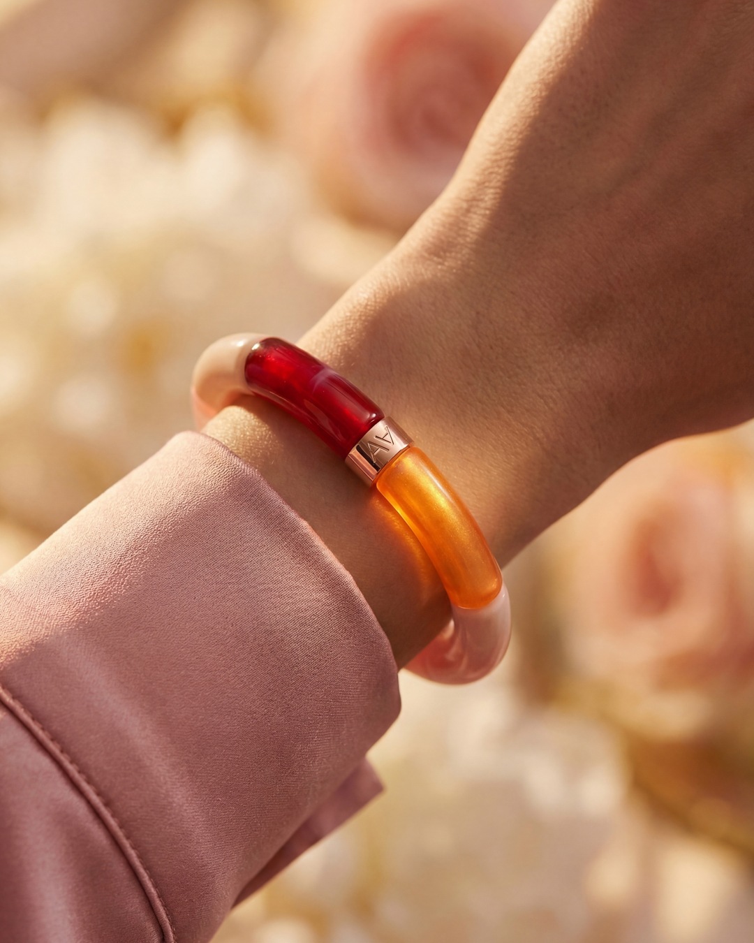 Lassen Sie sich von diesem handgefertigten Acetat-Armband verführen – Symbol für erschwinglichen Luxus und verantwortungsvolle Mode.