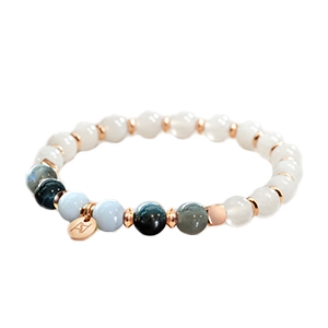Der Rest des Armbands besteht vollständig aus Mondstein, einem sehr geschätzten Edelstein für seinen milchigen Glanz und sein wunderschönes perlmuttartiges oder bläuliches Lichtspiel namens Adulareszenz,