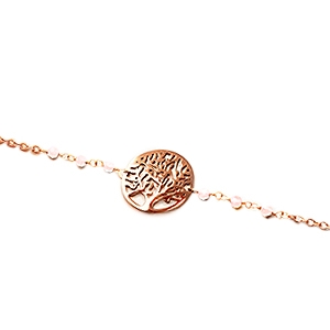 Das Armband Comiti zeichnet sich durch eine elegante Kette aus, die mit sechs kleinen facettierten Rosenquarzsteinen verziert ist und ein Lebensbaum-Motiv in der Mitte hervorhebt.