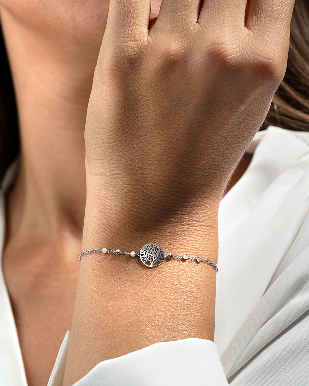 Das Armband Rimiti zeichnet sich durch eine elegante Kette aus, die mit sechs kleinen facettierten Rutilquarz-Steinen mit Turmalin-Einschlüssen verziert ist und ein Lebensbaum-Motiv in der Mitte hervorhebt.