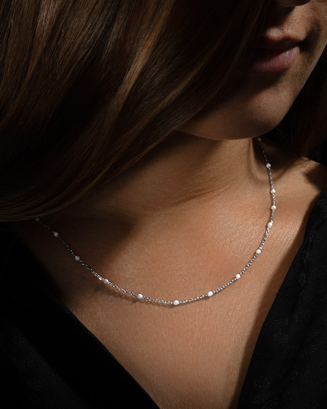 Der Anhänger Lenaya besteht aus einer silberfarbenen Edelstahlkette, die mit zarten Ornamenten aus weißem Emaille verziert ist. Die Halskette hat eine Gesamtlänge von 50 cm, mit einem Hauptteil von 43 cm und einem verstellbaren Teil von 7 cm, so dass sie sich jeder Körperform anpasst. Diese Halskette wird zu einem unverzichtbaren Accessoire, das perfekt zu ihrem Armband und anderen Schmuckstücken der Marke Anna Velazia passt.