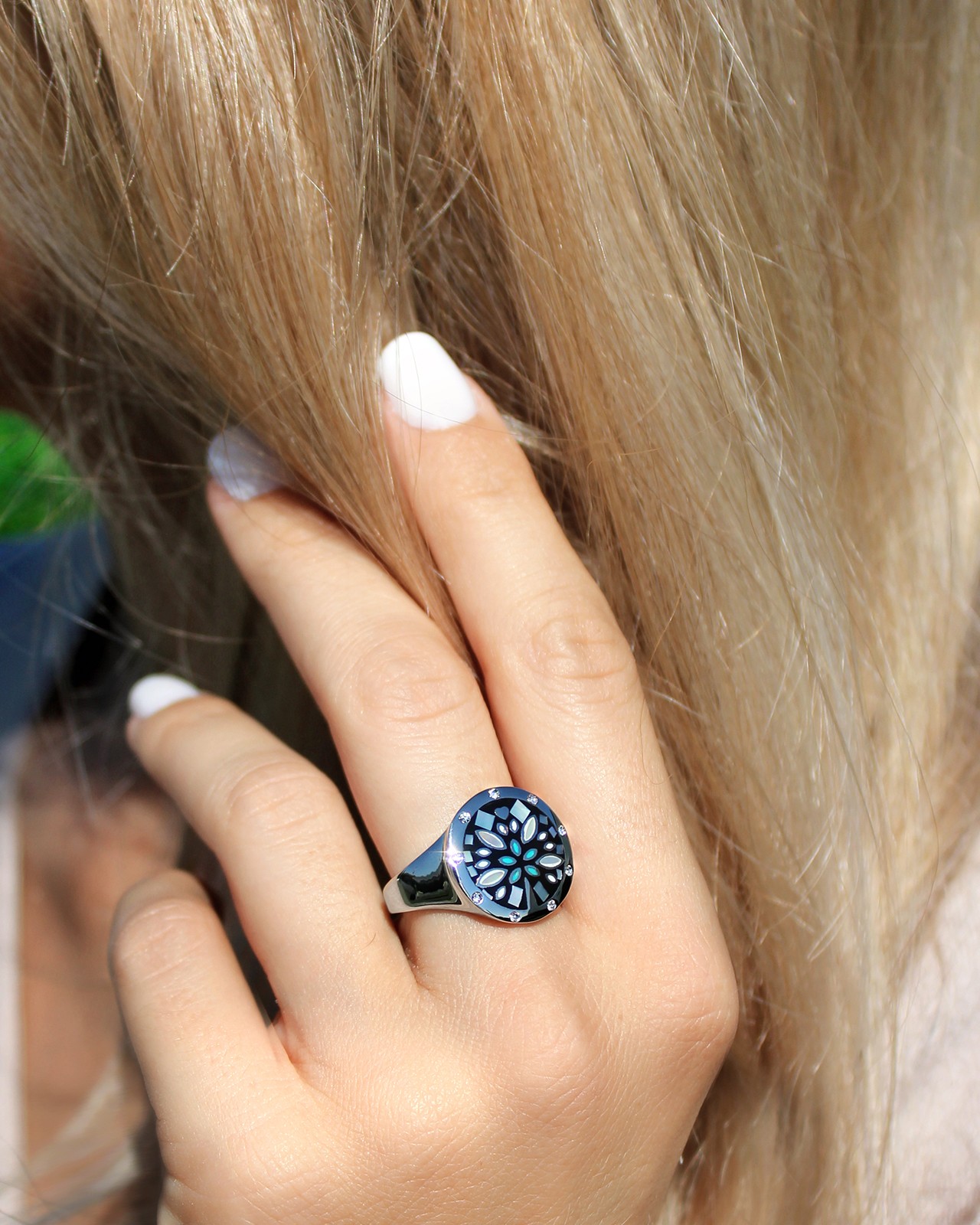 Der Ring Alberina Nera ist aus emailliertem Stahl gefertigt, mit Perlmutt besetzt und mit kleinen Strasssteinen verziert.