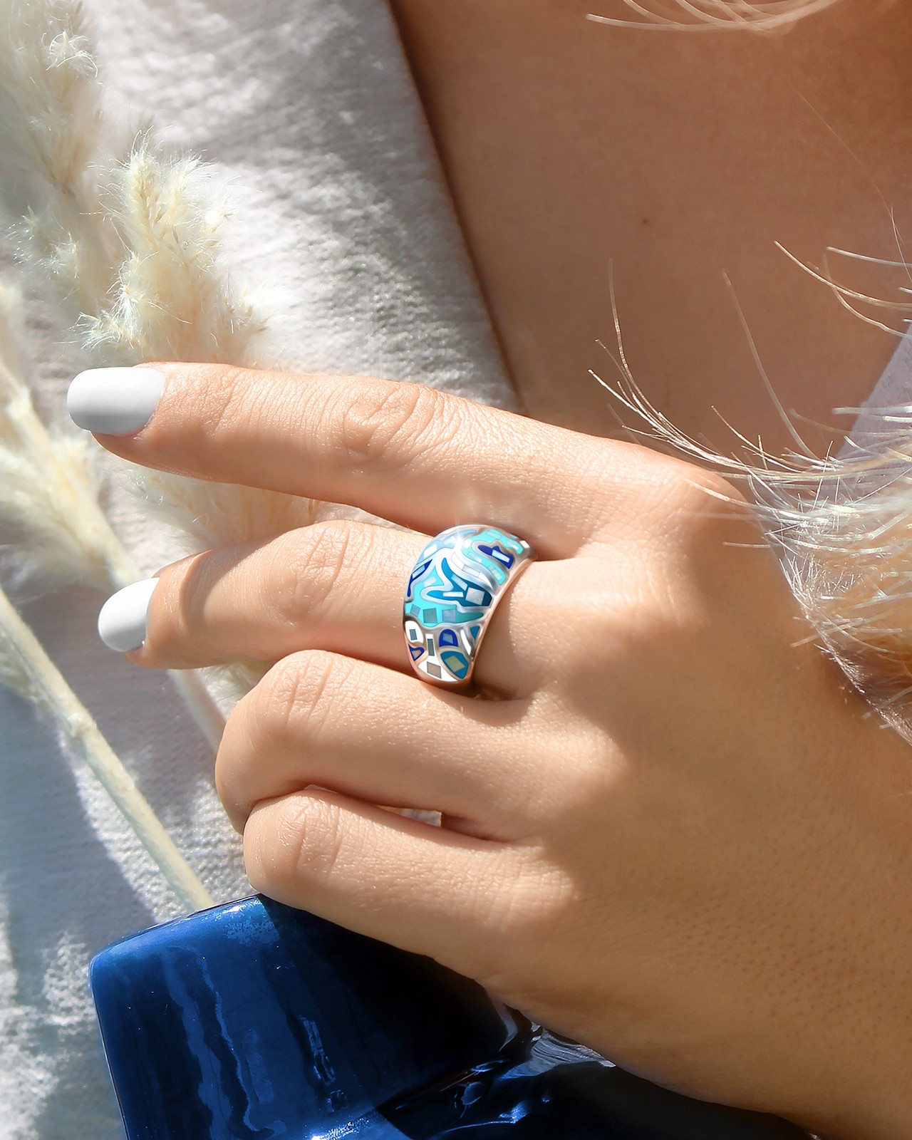 Dieses Stück aus Perlmutt wird Sie durch seine herrliche und leuchtend blaue Farbpalette auf Reisen schicken.