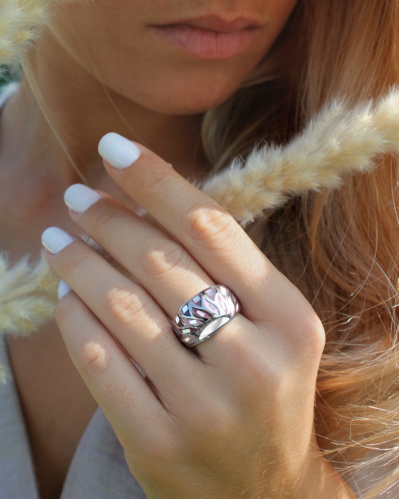 Auf diesem perlmuttfarbenen Schmuckstück ist eine erhabene Palette von Rosa gezeichnet, die durch diese kleinen Perlmuttblüten belebt wird.