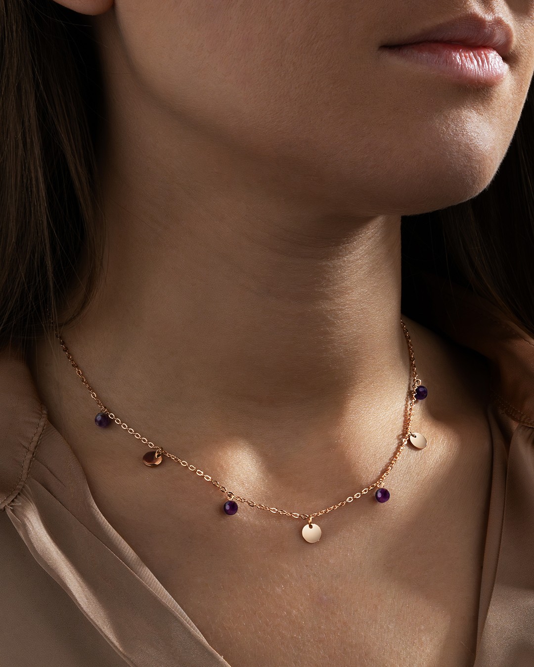 Die Halskette Scopellotto ausrosévergoldeten Edelstahl ist mit 4 wunderschönen Amethysten geschmückt, die sorgfältig zwischen den von Anna Velazia signierten Anhängern angeordnet sind. Mit einer Länge von 48 cm und einem verstellbaren Teil von 6,5 cm passt sich dieses Halsband leicht Ihrem Halsumfang an. In der Steinheilkunde wird der Amethyst mit den Symbolen Weisheit, Demut und Stärke in Verbindung gebracht. Unsere Schmuckstücke bestehen aus natürlichen Steinen und sind daher alle unterschiedlich. Daher können je nach Modell Unterschiede in Größe und Farbnuancen auftreten. Diese Unterschiede machen jeden Stein einzigartig.