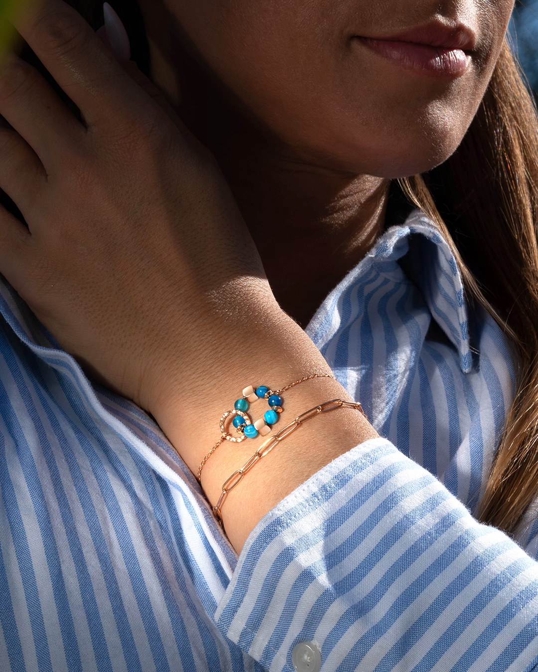 Das Armband Azzurra besteht aus einer zarten rosévergoldeten Edelstahlkette, die in der Mitte von einem floralen Motiv aus blauem Achat veredelt wird, verflochten mit einem gehämmerten Ring aus roséfarbenem Edelstahl.