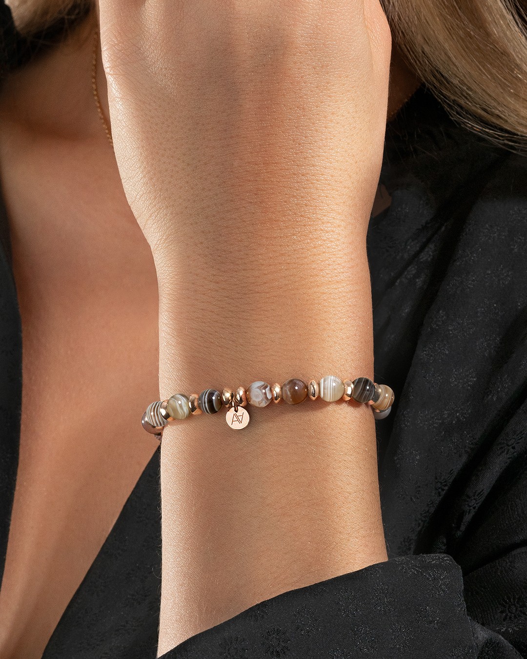 Das Armband Avellino ist mit wunderschönen Botswana-Achatsteinen besetzt. Das Herzstück ist ein von Anna Velazia entworfenes, rosévergoldetes Plättchen aus Edelstahl, das Ihrem Handgelenk einen Hauch von Farbe verleiht.Der Botsuana-Achatstein hat die Eigenschaft, Glück zu bringen. Dieser Stein erhöht das Glücksgefühl um das Zehnfache. Dieses Armband zieht mit seinen warmen Farben die Aufmerksamkeit auf sich und lässt Ihr Outfit erstrahlen. Unsere Schmuckstücke bestehen aus natürlichen Steinen, die alle unterschiedlich sind. Daher kann es bei jedem Modell zu Abweichungen in der Größe und den Farbnuancen kommen. Es sind diese Unterschiede, die jeden Stein einzigartig machen. Die Anzahl der Natursteine kann von Armband zu Armband variieren.