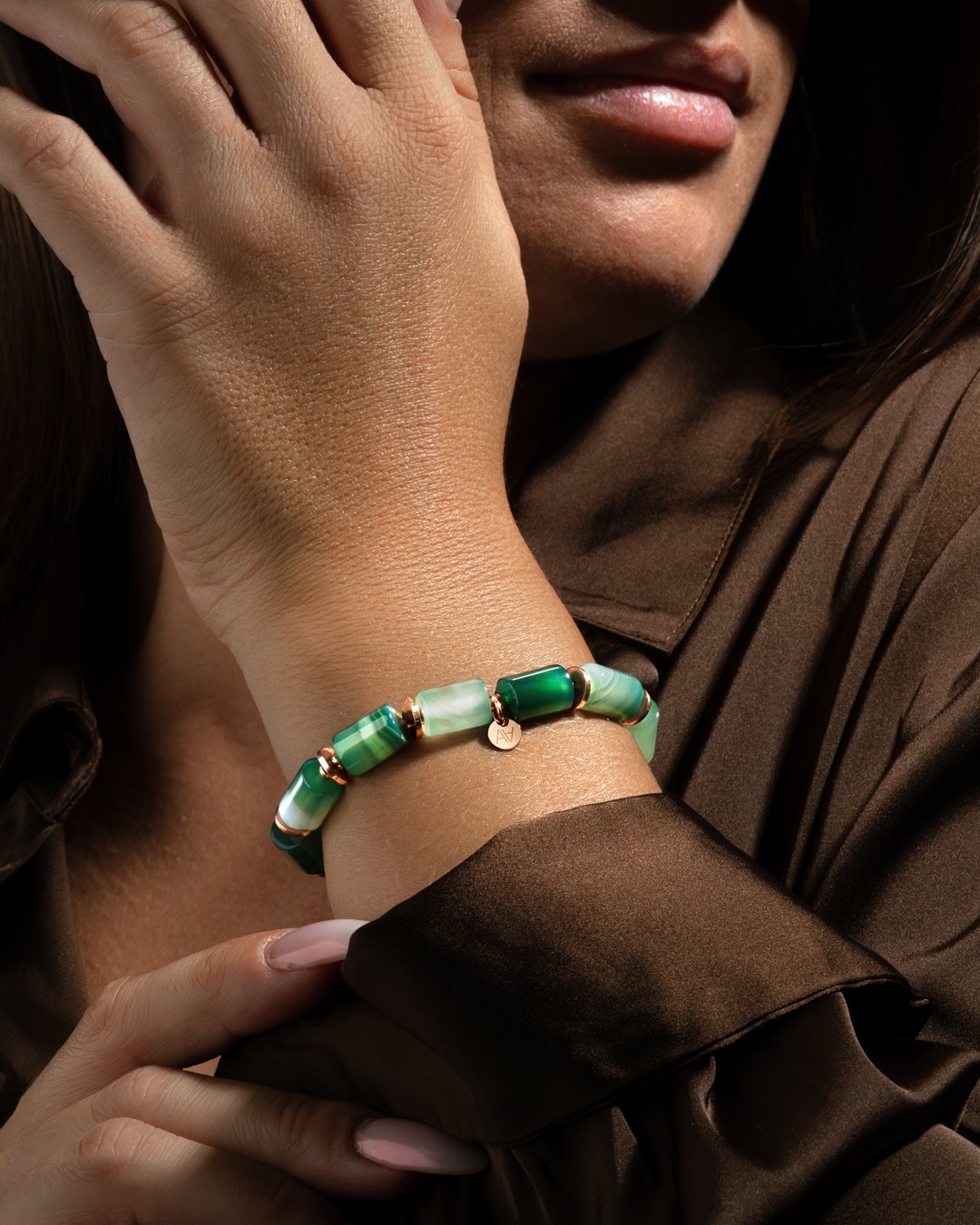 Das Armband Verbania besteht aus fein gestreiften Röhren aus grünem Achat, veredelt durch Trennstücke aus roséfarbenem Edelstahl. Die Eleganz dieses Armbands wird durch eine zentrale, von Anna Velazia signierte Scheibe aus rosévergoldetem Edelstahl verstärkt, die einen Hauch von zeitlosem Raffinement verleiht.
