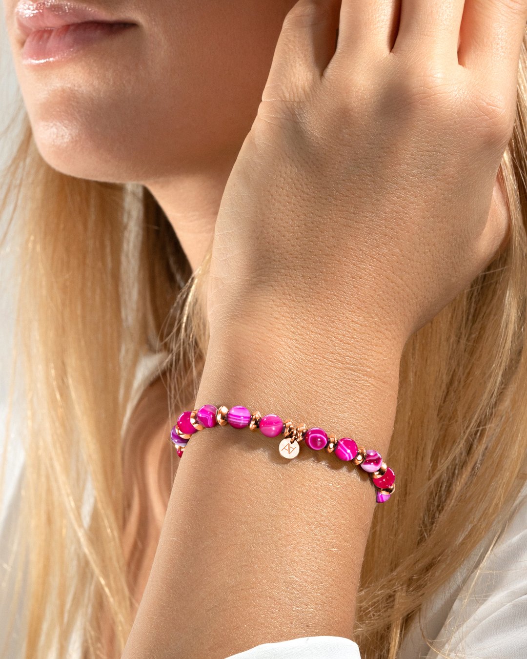 Das zentrale Element ist eine von Anna Velazia signierte Plakette aus rosévergoldetem Edelstahl, die dem Handgelenk eine elegante und warme Note verleiht.