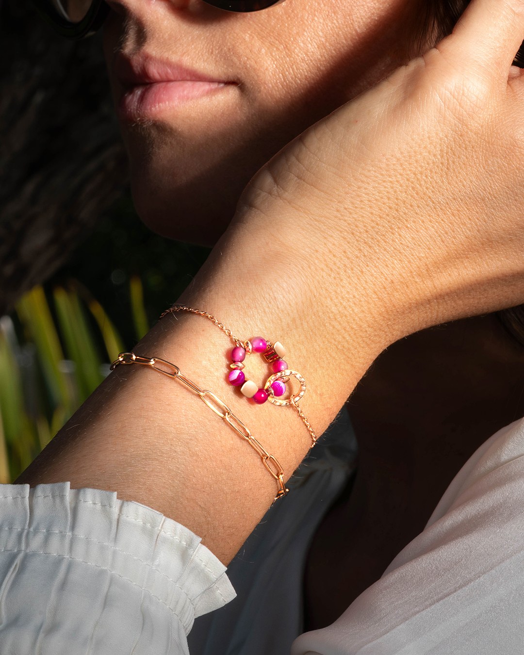 Das Armband Rosela besteht aus einer filigranen rosévergoldeten Edelstahlkette, die in der Mitte von einem floralen Motiv aus rosafarbenem Achat veredelt wird, verflochten mit einem gehämmerten Ring aus roséfarbenem Edelstahl.