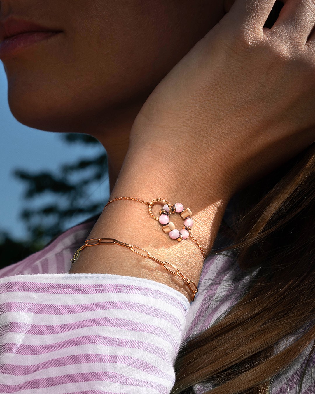 Das Armband Aurora besteht aus einer zarten rosévergoldeten Edelstahlkette, die in der Mitte von einem floralen Motiv aus Rosenquarz veredelt wird, verflochten mit einem gehämmerten Ring aus roséfarbenem Edelstahl.