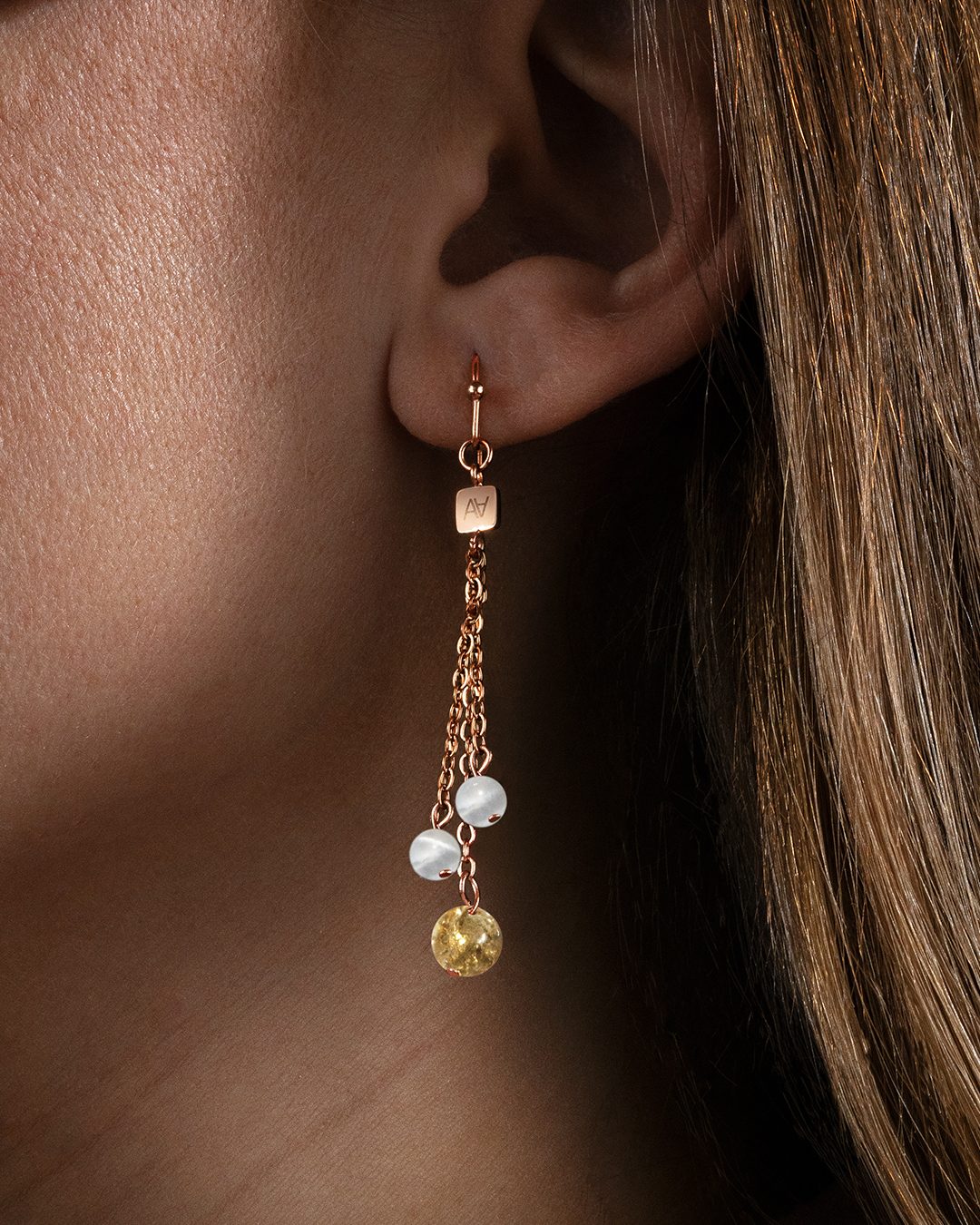 Die Sonnenenergie des Citrins verschmilzt mit der leuchtenden Sanftheit der Selenit und macht diese Ohrringe zu einem Talisman des Gleichgewichts und der Harmonie für Körper und Geist. Diese Kombination erinnert an das ewige Spiel zwischen Yin und Yang, zwischen dynamischer Kraft und beruhigender Ruhe.