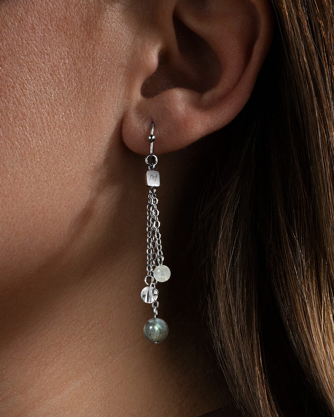 Die Ohrringe, die Mondstein, Bergkristall und Labradorit kombinieren, sind ein energetisches Juwel. Diese drei Steine, ausgewählt wegen ihrer einzigartigen und ergänzenden Eigenschaften, verweben ein Netz aus lebendigen Energien, um die Seele im Alltag zu begleiten.